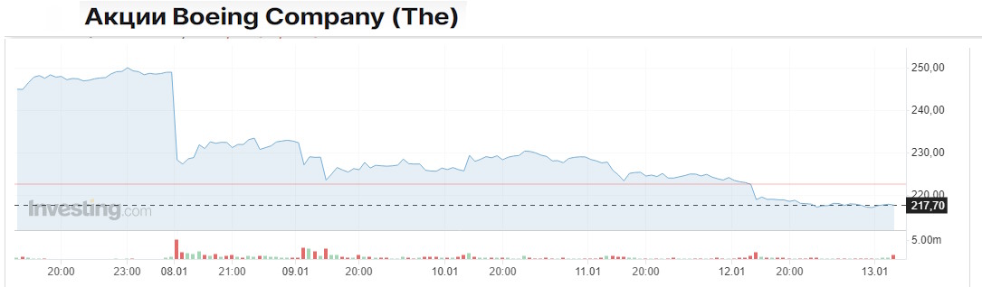 Стоимость акций Boeing 8 января рухнула на 12 процентных пунктов и продолжает снижаться