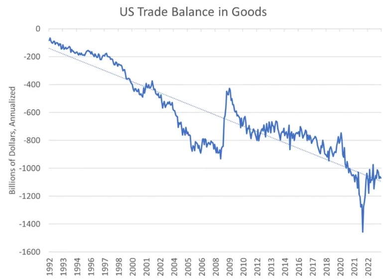 Когда президентом был Рональд Рейган, импорт капитальных товаров составлял около одной десятой от общих американских расходов на оборудование для бизнеса. К 2023 году импорт вырос до невероятных 63 процентов всех расходов США . Соединенные Штаты импортируют больше капитальных товаров, чем потребительских.