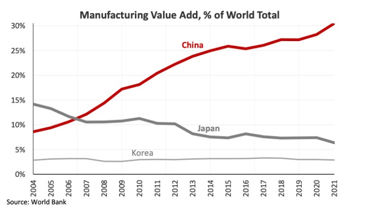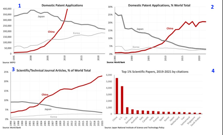Со второго места после Америки японские ученые опустились на 10-е место по количеству научных работ. По цитируемости Япония занимает 1 % от общего числа публикаций. Аналогичным образом, доля Японии в мировом производстве упала с более чем 20 процентов в 1995 году до 6 процентов в 2021 году. Стремительный взлет Китая в течение десятилетий "протекал" на фоне медленного упадка Японии — это общеизвестно. Все экономические графики Китая за последние четыре десятилетия выглядят одинаково - вправо и вверх под углом 45 градусов.