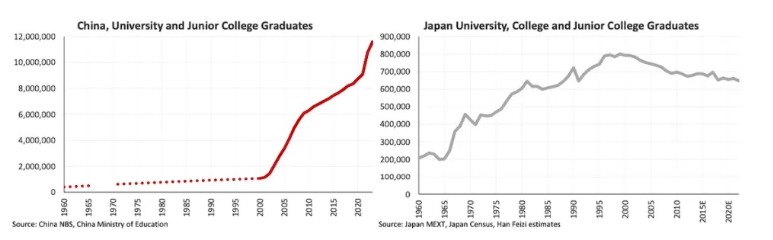 Япония страдает не чем иным, как потерей жизненной силы: молодежь выращенная в стиле "бонсай", пытается решить проблемы снижением амбиций, отстраняясь от общества (хикикомори), превращаясь в "травоядных" (безбрачных) и заключая браки с кавайными аниме-персонажами. Графики: слева — Китай, выпускники университетов и колледжей, справа — Япония Выпускники университетов, колледжей и младших курсов колледжей. Источники: China NBS, China Ministry of Education, Japan MEXT, Japan Census, Han Feizi estimates.