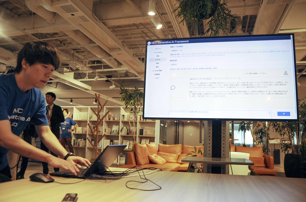 Сотрудник NEC демонстрирует новый сервис компании, использующий генеративную модель искусственного интеллекта с высоким уровнем владения японским языком. Июль 2023 г., Токио. Изображение Киодо Цусин | KYODO.