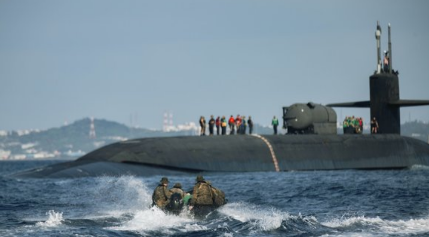 На снимке: субмарина класса "Огайо" во время совместных учений с американскими морскими пехотинцами. Окинава, Япония, 4 февраля 2021 года. (U.S. NAVY)