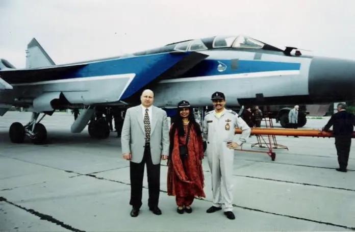 MIG-31 Anil Chopra. Фотография сделана сразу после полета Анила Чопры на МиГ-31. На фото генеральный директор завода В. Панков и г-жа Нирупама Рао Менон, в то время заместитель главы миссии, а впоследствии посол Индии в Соединенных Штатах и руководитель индийского внешнеполитического ведомства