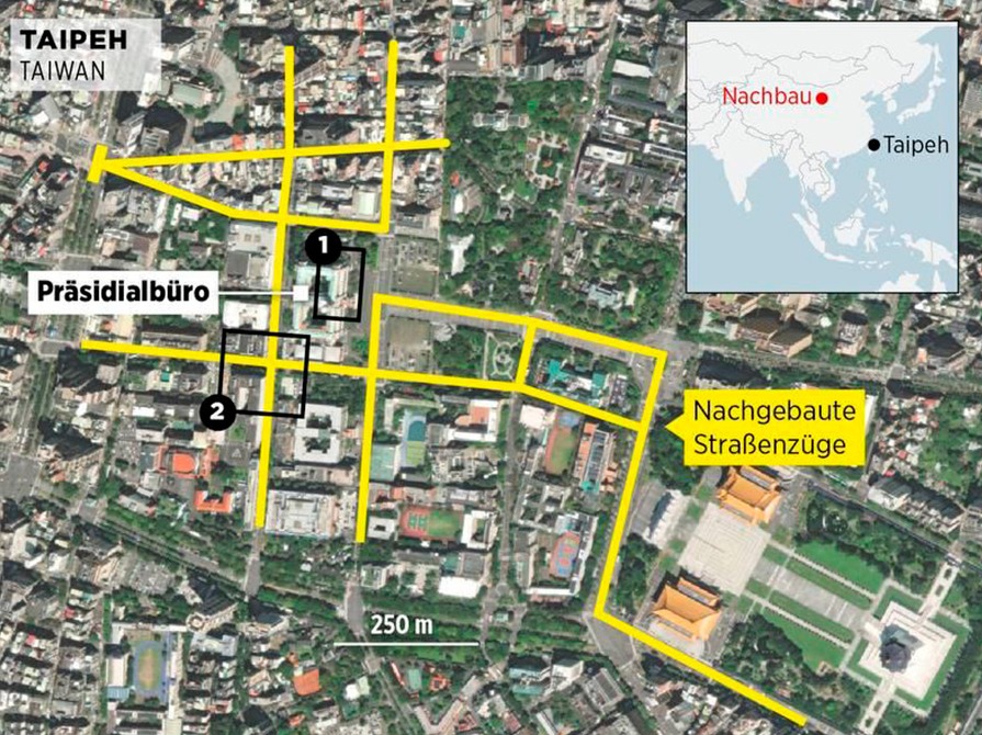 На спутниковых снимках, сделанных в 2020 году, также запечатлен масштабный макет центра Тайбэя на той же тренировочной базе, дополненный копиями главных правительственных и административных зданий.
