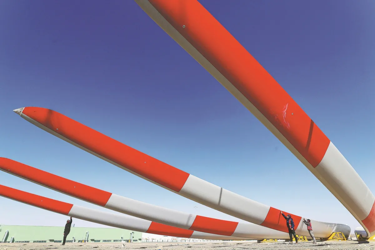 Специалисты осматривают лопасти ветряных турбин в промышленном парке в Чжанъе, провинция Ганьсу. Фото: China Daily / Wang Jiang / Facebook Screengrab