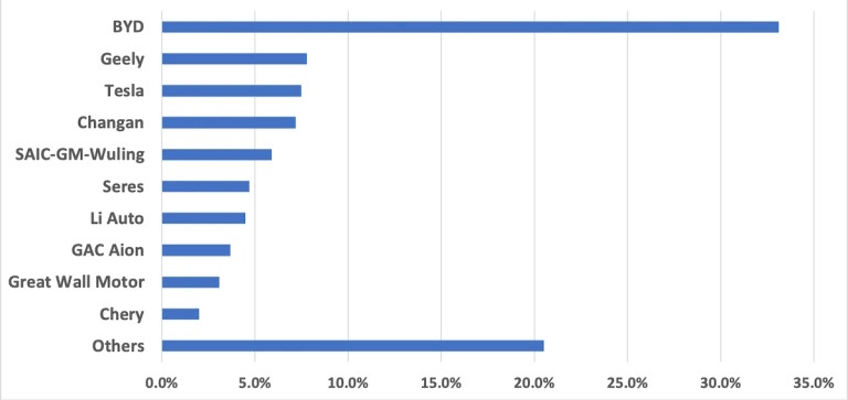 Продажи электромобилей Tesla снизились на 3,6 процента по сравнению с прошлым годом, в то время как продажи BYD увеличились на 15,2 процента. Продажи Geely выросли в 2,4 раза, Changan - в 2,1 раза, а SAIC-GM-Wuling - на 35,2 процента. За исключением GAC Aion, второй эшелон китайских автопроизводителей также продемонстрировал высокий рост продаж.
