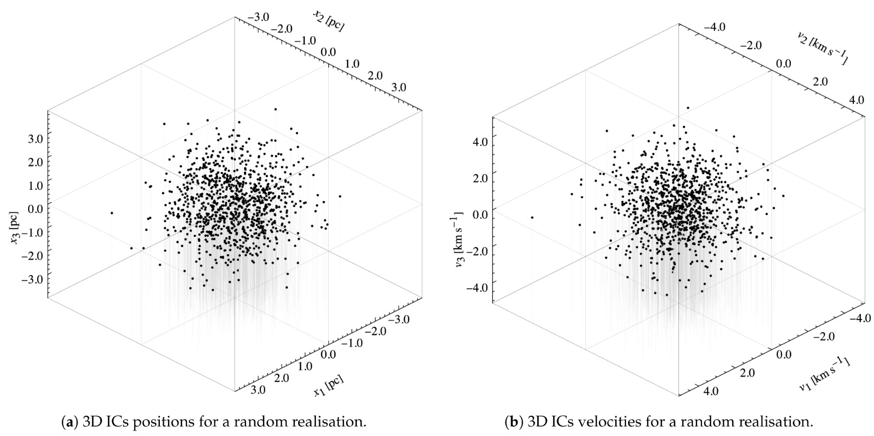 Координаты (а) и скорости (b) ПЧД-скопления. И положения, и скорости соответствуют выборке изотропного максвелловско-больцмановского распределения. Обратите внимание, что в начальный момент времени между массами и положениями (координатами) не наблюдается корреляции, то есть более массивные ПЧД пока не скапливаются в барицентрах кластера.