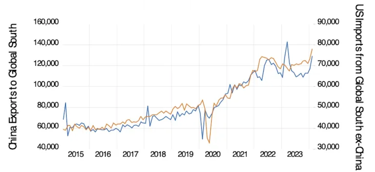 Тарифная политика США в отношении китайских товаров перенаправила глобальные цепочки поставок в третьи страны. Как видно из графика, китайский экспорт в страны Глобального Юга идет в унисон с американским импортом из стран Глобального Юга. Дефицит торгового баланса США в 2023 году достиг рекордной отметки в 1 триллион долларов.