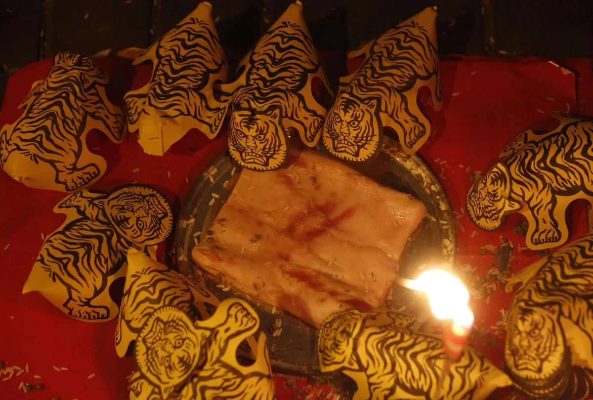 Бумажные тигры выставлены в павильоне для "битья злодеев" в Гонконге, четверг, 6 марта 2014 года. "Битье подлого человека" или «Да сяожэнь» это южнокитайский народный обряд, популярный в китайском регионе Гуандун, в том числе и в Гонконге. Смысл его заключается в том, чтобы при помощи магии наложить проклятие на своих врагов. Обычно церемонию проводят пожилые женщины. (Associated Press News, APS Photo/Kin Cheung)