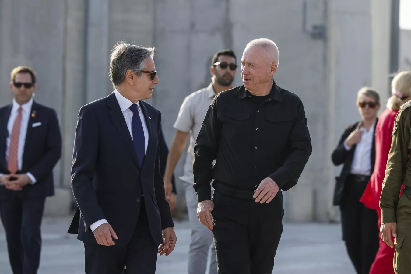 Госсекретарь США Энтони Блинкен прогуливается с министром обороны Израиля Йоавом Галлантом (справа) на контрольно-пропускном пункте Керем-Шалом на границе Израиля и южной части сектора Газа, среда 1 мая 2024 года. Associated Press AP Photo / Evelyn Hockstein