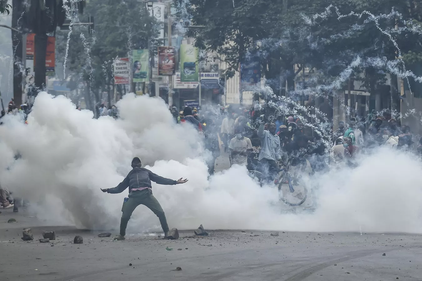 На снимке запечатлен момент детонации баллончика со слезоточивым газом во время антиправительственных протестов в Найроби 16 июля 2024 года. Протестующий жестами пытается что-то показать кенийским полицейским Во вторник полиция вышла на улицы в центре столицы Кении после призывов к новым демонстрациям против правительства президента Уильяма Руто. (Agence France-Presse, AFP 2024 / Simon Maina)