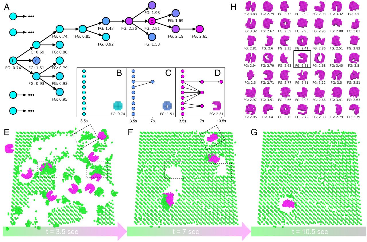 Эволюционная саморепликация. (Кратко) Независимые эволюционных испытания привели к развитию самовоспроизводящихся роев с различными формами потомков (H).Источник: https://www.pnas.org/content/118/49/e2112672118