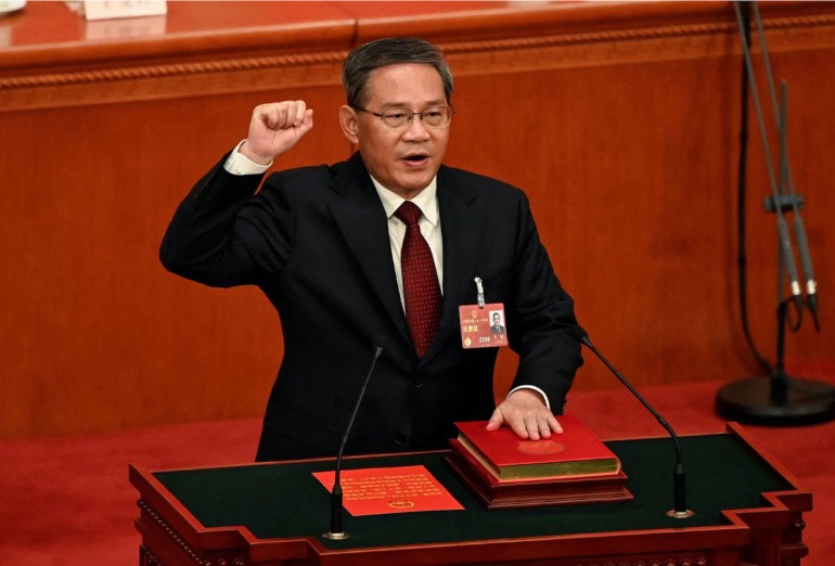 Новый премьер-министр Китая Ли Цян принимает присягу после своего избрания во время четвертого пленарного заседания Всекитайского собрания народных представителей (ВСНП) в Большом зале народных собраний в Пекине, Китай, 11 марта 2023 года. Image: Pool / Twitter / Screengrab. Journal Asiatimes.
