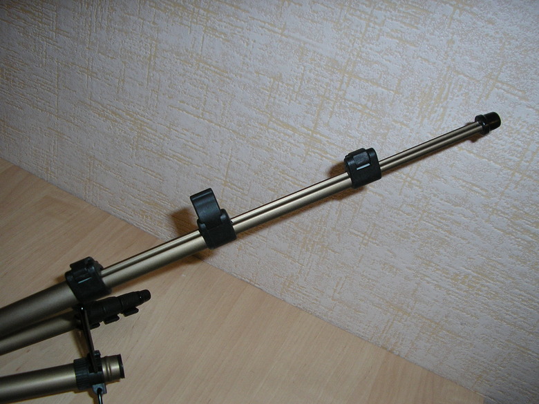 Штатив поднимается за счет выдвигающихся ножек, в качестве фиксаторов используются пластиковые защелки.