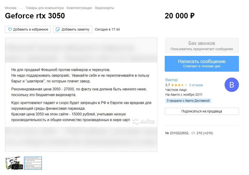 Впрочем, карты тут же материализовались уже на просторах таких площадок, как Avito, где счастливые обладатели полезных знакомств и блата выставляли их уже по ценам в три раза выше розничных. Притом, у некоторых оказалось неприлично много новеньких видеокарт в наличии. Геймеры такой беспредел терпеть не стали, проявили весьма чёткую гражданскую позицию и солидарность друг с другом в данном вопросе, решив как следует подпортить игру перекупам уже отработанными сравнительно недавно методами, разместив на площадке огромное количество фейковых объявлений о продаже подобного товара по ценам, близким к рекомендованным. В размещённых «объявлениях» многие, так или иначе, выражают свою позицию и выявляют недовольство сложившейся обстановкой.