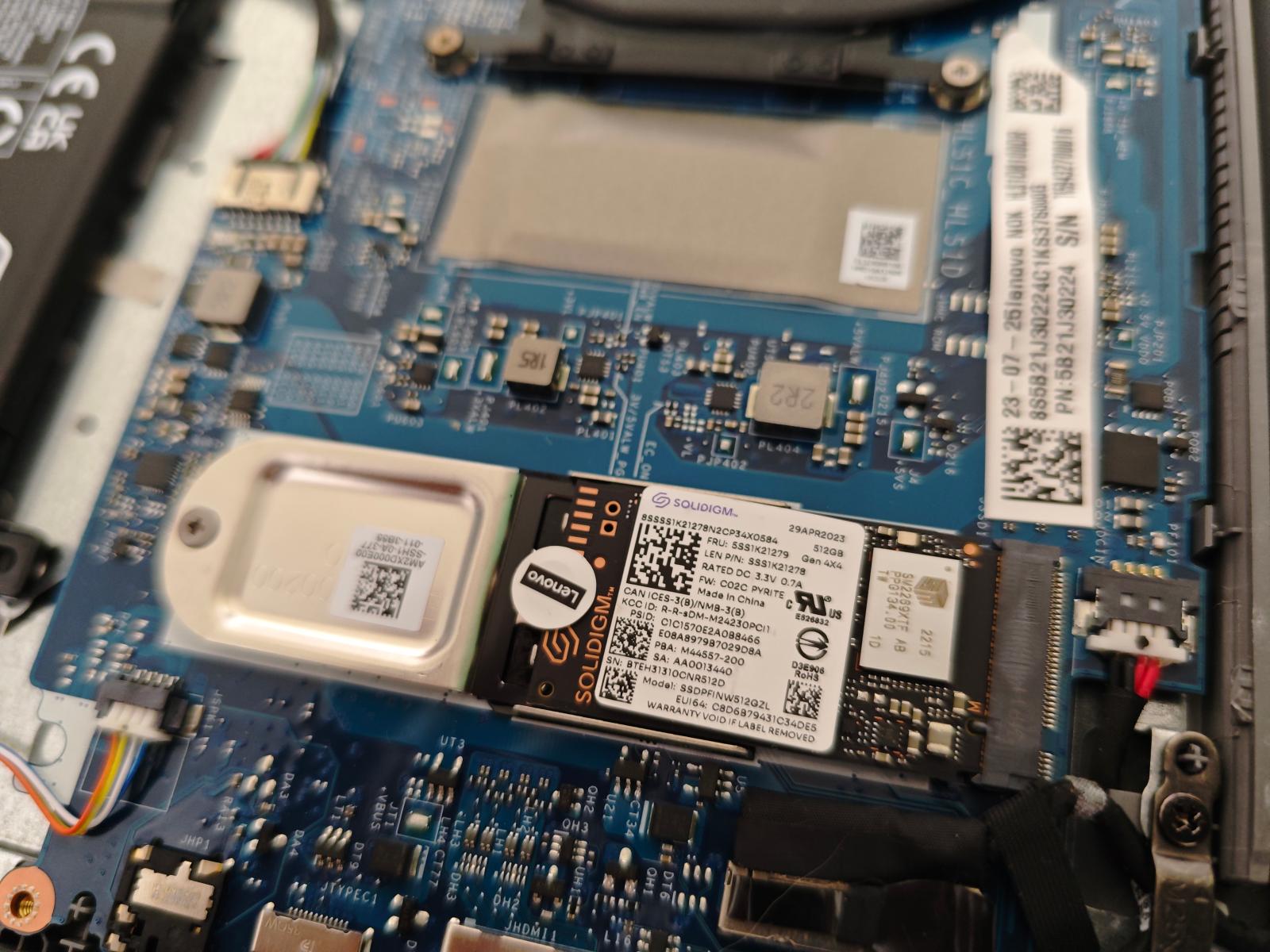 Также видим NVME SSD Solidigm SSDPFINW512GZL объёмом, как уже понятно, 512Gb. А вот надежда на увеличение количества оперативной памяти умерла — 2 микросхемы LPDDR5 Micron MT62F1G32D4DR-031 WT распаяны прямо на плате.