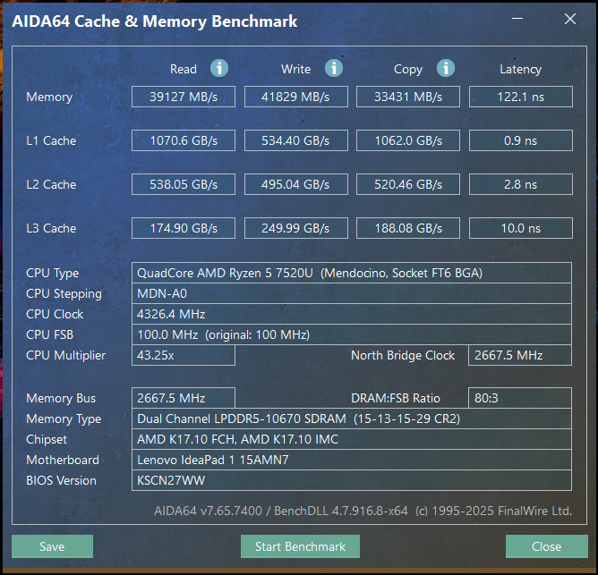 Далее тест памяти AIDA, в котором испытуемый показал себя достаточно средненько.