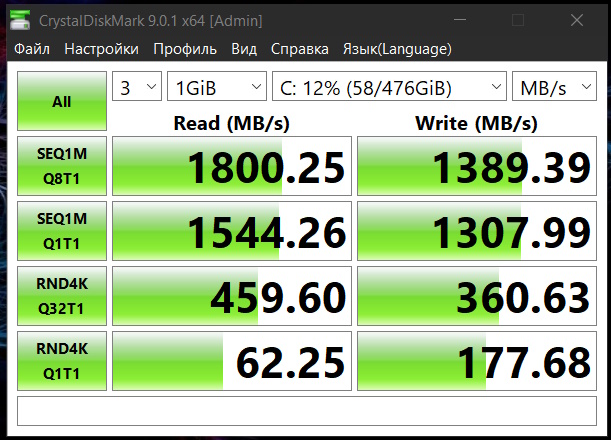 И наконец тест накопителя CrystalDiskMark 9.0.1.