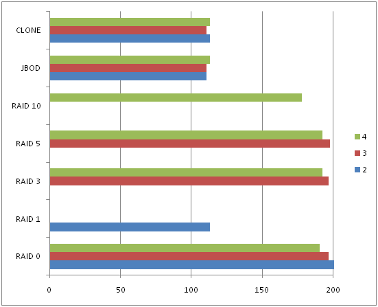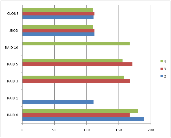 где 2, 3 и 4 это количество дисков, а по оси Х скорость в Мбайт/сек.