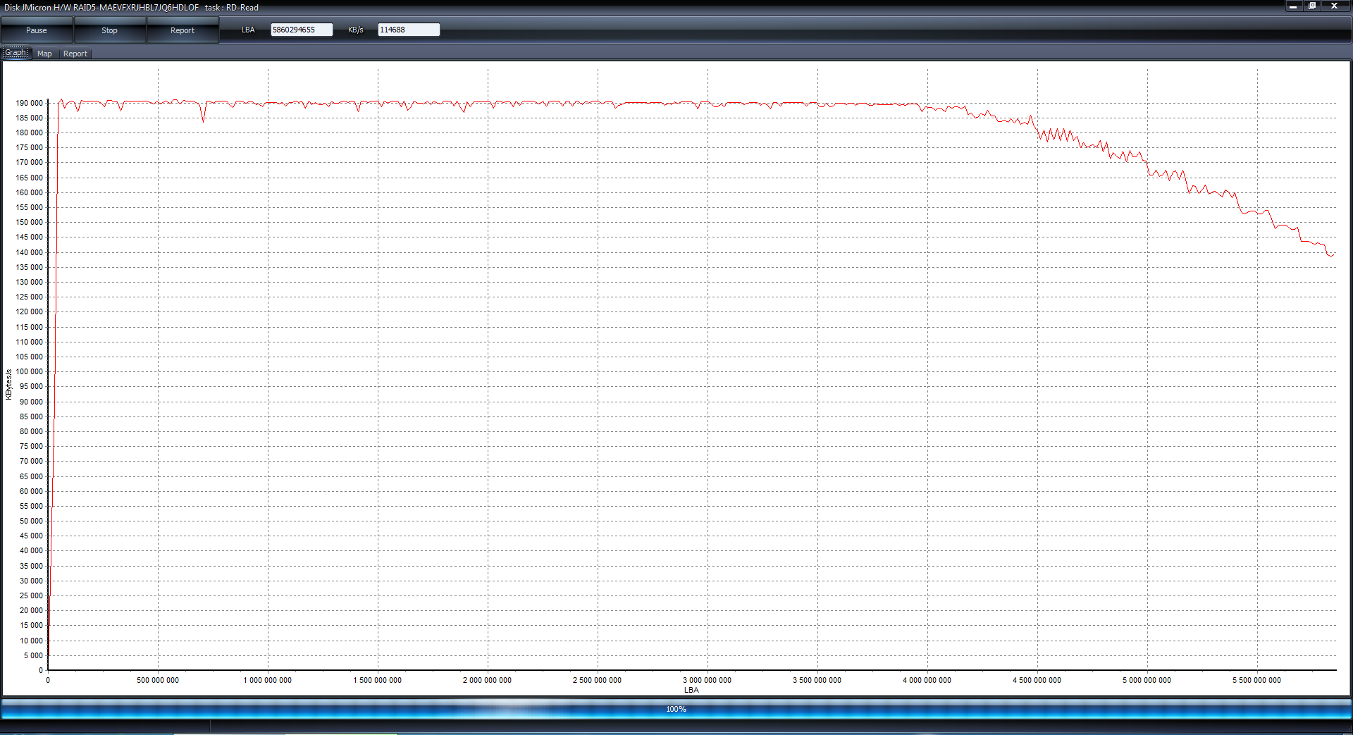 Это график теста поверхности RAID 5 массива из четырех дисков. При этом тесте, данные читаются с поверхности диска, но не передаются через USB 3.0 интерфейс. Как видим, скорость чтения составляет в пике более 270 Мб/сек, почти SATA II производительность, на какую и рассчитан был JMB394 – основа нашего устройства. Некоторую «ухабистость» графика я объясняю сборною солянкой из трех типов дисков, а точнее их объемами кэш-буферов – 8, 16 и 2 по 32 Мбайт. Опять же видим, что алгоритм упреждающего чтения работает (откуда тогда берутся такие почти периодические пики?). Тот же массив в режиме чтения: