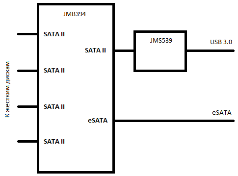 Теперь о второй микросхеме. Это мост между SATA II и USB 3.0, естественно, заявлена обратная совместимость с USB 2.0. Путем анализа спецификаций и изучения текстолита печатной платы автором была получена следующая функциональная схема устройства девайса: