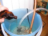 Радиатор нужно было полностью очистить от грязи. Иначе частичка ржавчины может попасть в масло, а из масла - в блок питания со всеми вытекающими последствиями в виде замыкания. Промывка под мощной струёй воды ессно ничего не дала (только немного смылось). Тогда я поступил следующим образом: пустил по батарее раствор серной кислоты. Самой кислоты было ~100мл, безводной. Наливаем: