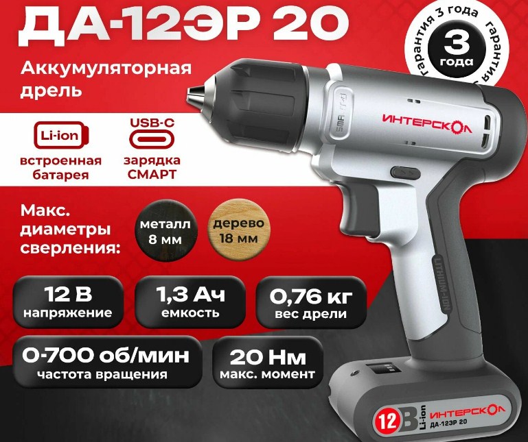 Скорость до 700 об/мин, быстрозажимной патрон, крутящий момент 20 Нм, есть подсветка рабочей зоны, реверс, в комплекте аккумулятор 1300 мАч