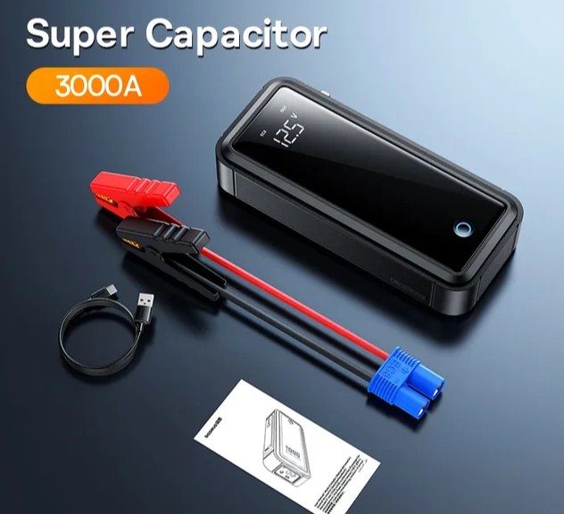 Джамп стартер со встроенным аккумулятором на 3000mah. С его помощью можно легко завести автомобиль с разряженным аккумулятором много раз.