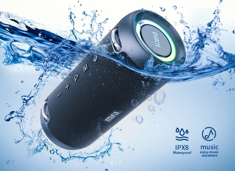 Мощная 60-ваттная колонка подойдёт для шумных вечеринок на свежем воздухе. Благодаря защите по стандарту IPX8 модель не боится брызг воды, дождя и снега. RGB‑подсветка на торцах подстраивается под звучащий трек. Внушительную автономность до 30 часов обеспечивает аккумулятор на 8 000mah.