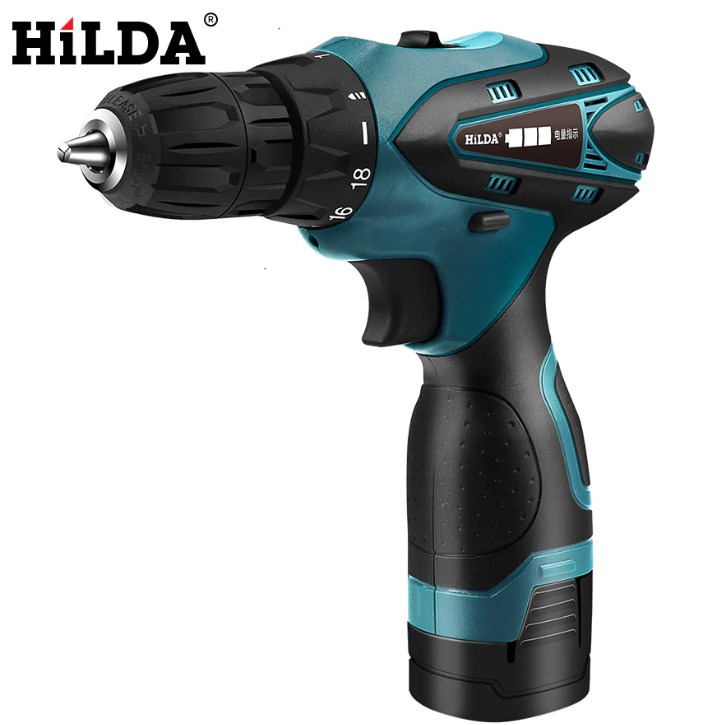 Оптимальный шуруповерт на 16,8V (4 банки). Поставляется в пластиковом кейсе, хотя есть вариант и с обычной коробкой. Крутящий момент 32Нм, что с лихвой хватит для всех задач. По внешнему виду представляет копию Макиты. Судя по обзорам инструмента Hilda — качество хорошее, можно брать.