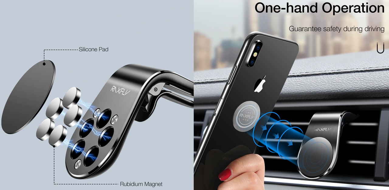 Полезная штука для автолюбителей, особенно для тех, кто использует смартфон в качестве навигатора. В его корпусе находится 5 мощных неодимовых магнита, которые надежно притягивают вторую пластину, которая крепится на обратную сторону смартфона или под чехол.