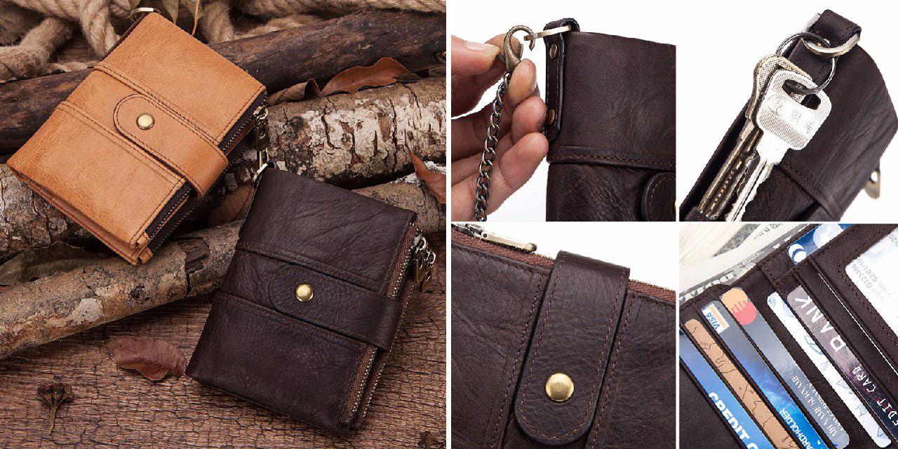 Кожаный кошелёк с двумя отделениями на молнии для монет, вместительным отделением для купюр и карманами для десятка банковских карт.