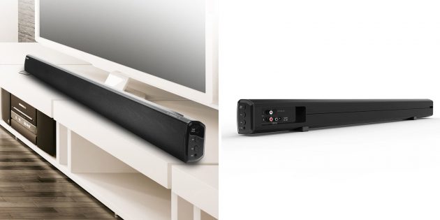 Саундбар мощностью 40 ватт с поддержкой Bluetooth 4.0. Его размеры — 800 × 65 × 46 мм. В комплекте есть пульт ДУ и кабели для подключения к источнику звука.