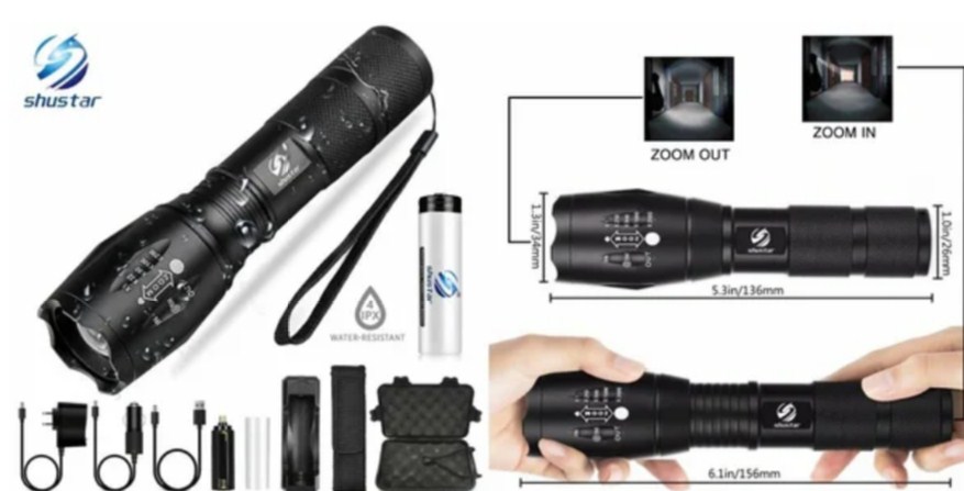 Модель, предлагаемая на AliExpress, получила надёжный алюминиевый корпус, автофокус светового потока, а также неплохую автономность, обеспечиваемую тремя батарейками типа ААА или аккумулятором на выбор.
