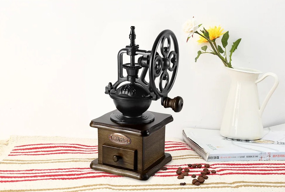 Выполненная в винтажном стиле, достойно смотрится. Работает от ваших рук, энергия не нужна. А размалывает отлично, прям как надо. Прикольная ретро кофемолка. Можно брать.