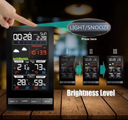 Для тех, кто всегда хочет знать точную погоду — и в доме, и «за бортом». Во втором случае поможет беспроводной датчик. Он также умеет отслеживать тенденцию изменения давления и на основе этого предсказывать погоду на ближайшие сутки. Устройство показывает уровень влажности и работает в качестве будильника.