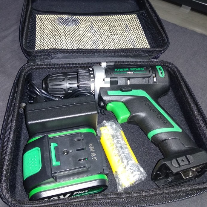 Компактный и лёгкий шуруповерт. Когда он ко мне пришел, аккумуляторы были полностью заряжены. Дизайн приятный, сочетание зеленого с черным выглядит достойно. Присутствует фонарик для более комфортной работы в темных участках.