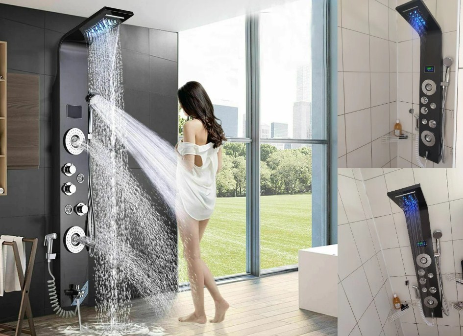 Продвинутая душевая консоль со множеством функций и светодиодной подсветкой. Предлагается 10 вариантов, которые отличаются цветом, конфигурацией и ценником. Стойка сделана из нержавеющей стали, выглядит солидно. Немного впечатления портит ручной душ из дешевого пластика, но его нетрудно заменить.