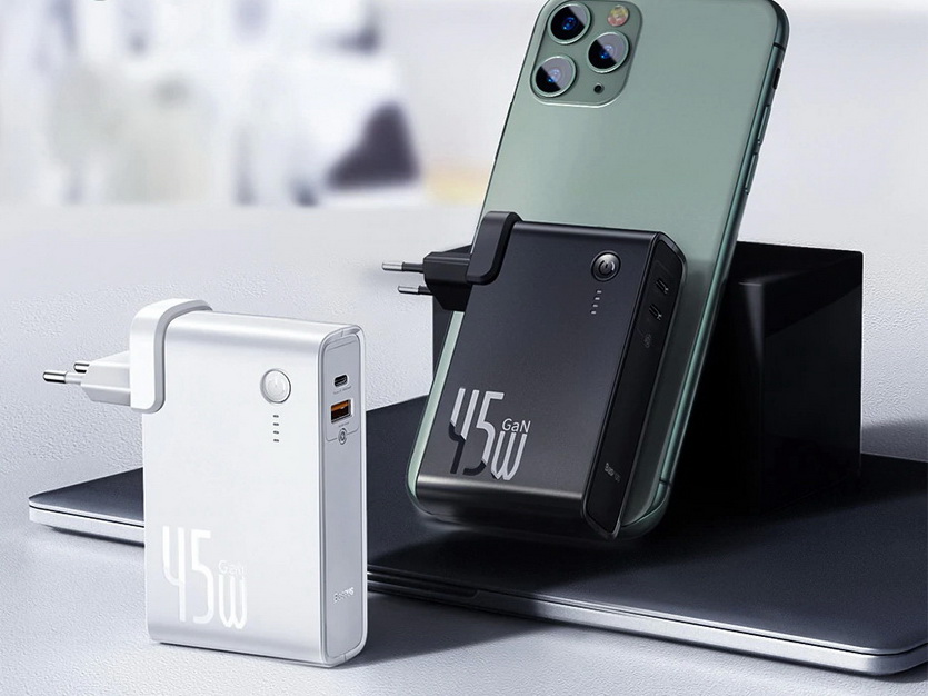 Один из наиболее интересных “энергитических” аксессуаров: GaN-зарядка на 45 Вт, совмещенная с внешним аккумулятором ёмкостью 10000 мАч.