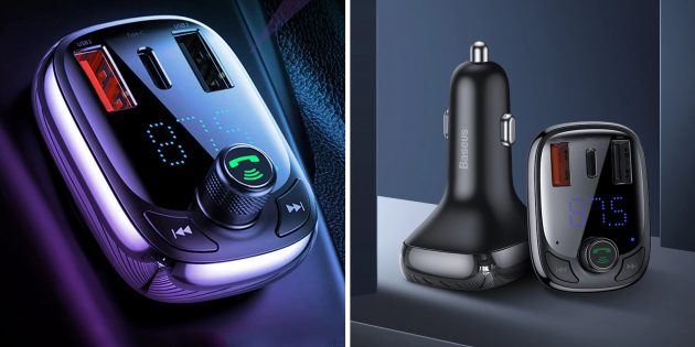 Автомобильный FM‑передатчик (12/24 В), который позволяет разговаривать по громкой связи, заряжать гаджеты через два USB‑порта и воспроизводить музыку через Bluetooth 5.0 с флешки или карты памяти microSD.
