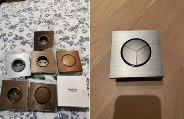 Стеновая панель для управления светом. Используется в качестве выключателя, розетки, различных переходников. Корпус выполнен из алюминиевых сплавов, сама кнопка находится по центру, делится на 3 сегмента каждый из которых подсвечивается светодиодной лампочкой.
