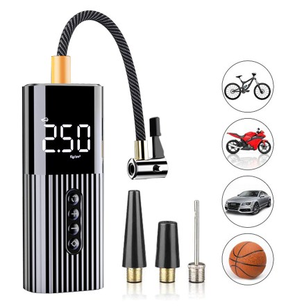 Используется для накачивания спортивного инвентаря, лодок, различных изделий из резины. Расход воздуха составляет 15 л/мин. Есть несколько систем измерений. Для удобства есть фонарик. Работает от встроенного аккумулятор или от прикуривателя авто.