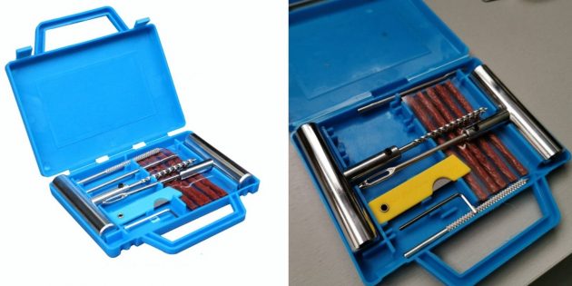 Набор для ремонта, который пригодится в дороге. Позволяет устранить прокол бескамерной шины всего за несколько минут. В кейсе лежат рашпиль и специальное шило с запасными наконечниками, а также каучуковые жгуты и резак.