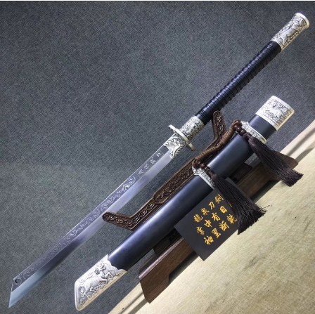 Декоративный меч из марганцевой стали, выполнен ручным способом, конструкция сделана с учетом всех особенностей китайской культуры единоборств. Двуручная рукоятка с крепким и удобным хватом. Лезвие широкое, имеет обоюдно острую заточку режущей кромки. Гарда, тыльник и ножны имеют рельефный узор, на лезвии есть надпись в виде иероглифов.