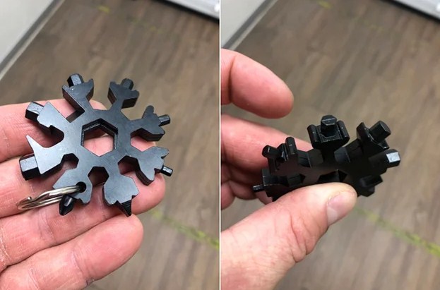 Многофункциональный инструмент с 18 рабочими наконечниками для обслуживания велосипеда, мелкого ремонта бытовой техники, в качестве вспомогательного предмета для хозяйственных нужд. Выполнен в форме звездочки на каждой из сторон находится плоская, крестообразная, шестигранная отвертка, есть гаечные ключи, открывалка для бутылок. Можно повесить на карабин, прикрепить к рюкзаку.