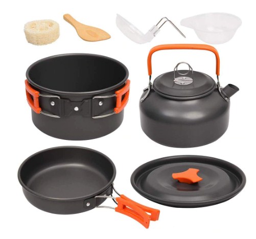 Набор посуды для приготовления пищи в походных условиях. В комплект входят: сковородка, чайник, кастрюля, четыре тарелки, поварёшка, деревянная лопатка и губка для мытья.