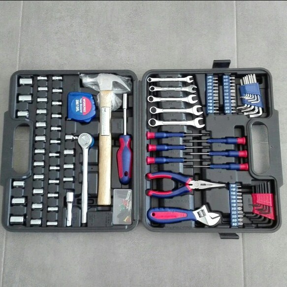Набор слесарного инструмента предназначен для ремонта и наладки. В комплект входит 123 предмета; набор состоит из пассатижей, отверток, гаечного и разводного ключа, шестигранных насадок, рожковых ключей, удлинителей. Все элементы сделаны из прочной хромо ванадиевой стали. Аккуратно располагаются в кейсе для хранения, габариты 40 на 35 см.