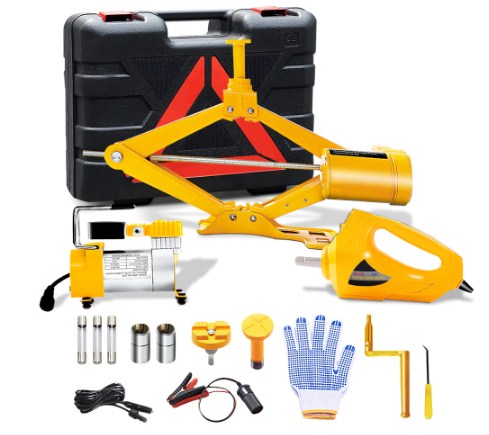 Данный комплект включает в себя специальный электрический гаечный ключ, компрессор для накачки шин, домкрат для поднятия автомобиля, накладываемые провода на контакты аккумуляторной батареи и прочее мелкие принадлежности. Электрический насос работает в пределах до 150 psi.