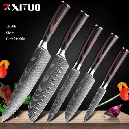 Комплект поварских ножей в количестве 10 штук. Среди них ножи для разделки рыбы, мяса, птицы. Есть те которые используется для нарезки овощей и фруктов, чистке, рубки, шинкования. Лезвие выполнено из сплава дамасской стали, которая не только выдерживает различные механические нагрузки, но также обработана антикоррозийным составом.