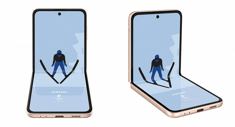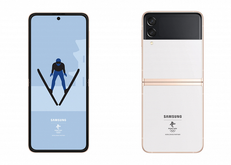 В преддверии зимних Олимпийских игр в Пекине компания Samsung анонсировала ограниченный выпуск Galaxy Z Flip3 в ознаменование этого большого события. Эксклюзивная Z Flip3 представлена в совершенно новом цвете Winter Dream White со спортивными золотыми акцентами на раме и шарнире, а область дополнительного дисплея имеет черную отделку. Мы также можем увидеть логотип Олимпийских игр в Пекине 2022 года в нижней части под логотипом Samsung.